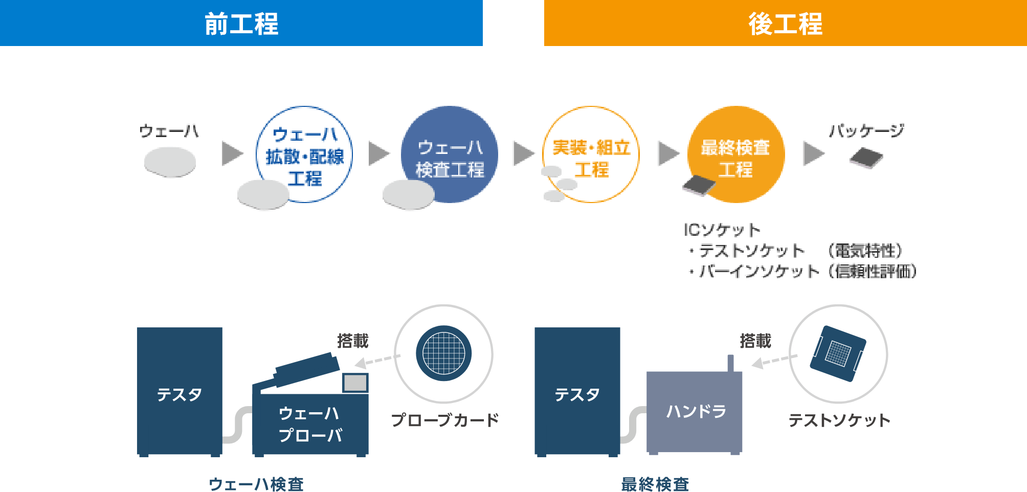 一つは前工程でウェーハ面に作られた多数の半導体(ダイ、チップという)を切断分離する前に、チップの電気的特性をおこなうウェーハ検査です。もう一つは、後工程で切断したチップを実装組立(パッケージ)した完成後におこなわれる最終検査です。